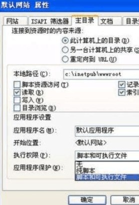 第四步:返回到默认网站属性窗口的“主目录”标签,将执行权限修改为“脚本和可执行文件”,这样才能够执行PHP程序。(如图8)