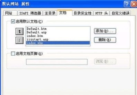 第五步:来到默认网站属性窗口的“文档”标签,将index.php添加到默认文档列表中。(如图9)